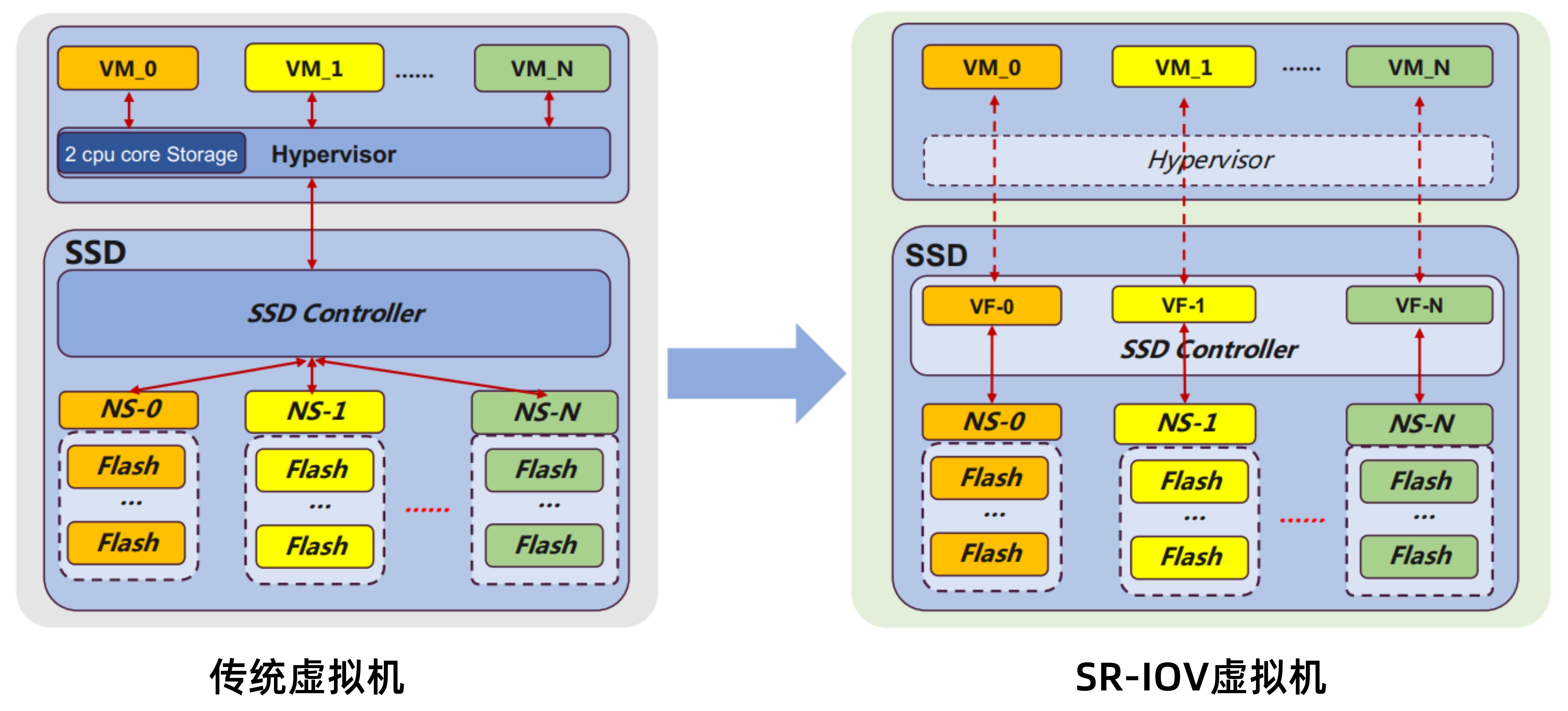 傳統(tǒng)虛擬化系統(tǒng)使用Hypervisor(或者VMM)軟件對虛擬機進行管理,軟件層既消耗CPU資源,又有較深的調(diào)用棧,使得PCIe設(shè)備的性能優(yōu)勢無法徹底發(fā)揮。而SR-IOV可以實現(xiàn)多個虛擬機共享物理資源,且bypass Hypervisor(或者VMM)軟件層,使得虛擬機可以使用到NVMe SSD的高性能。